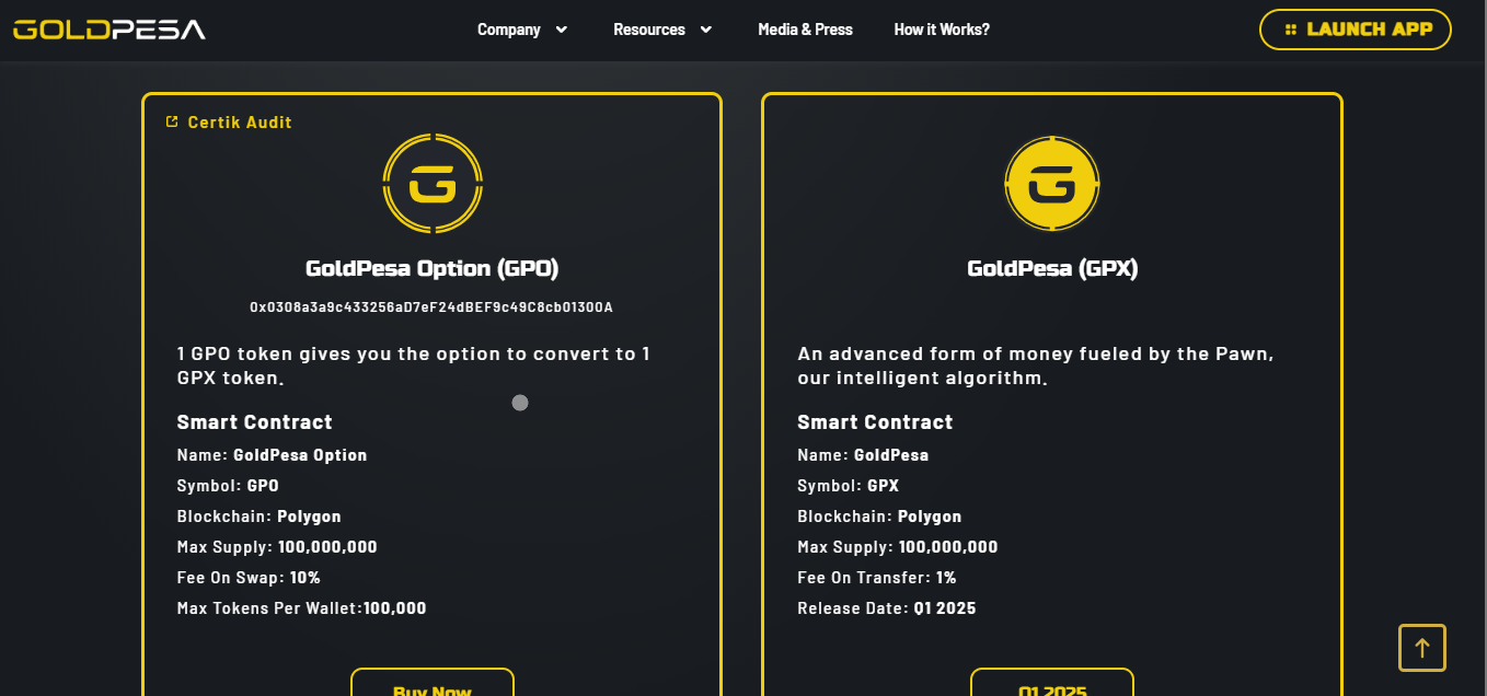 GoldPesa ($GPX) is an asset‑backed hybrid token where each token represents one gram of physical gold stored in secured vaults. It enables fractional ownership of gold bars alongside crypto market upside, distinguishing it from stablecoins.