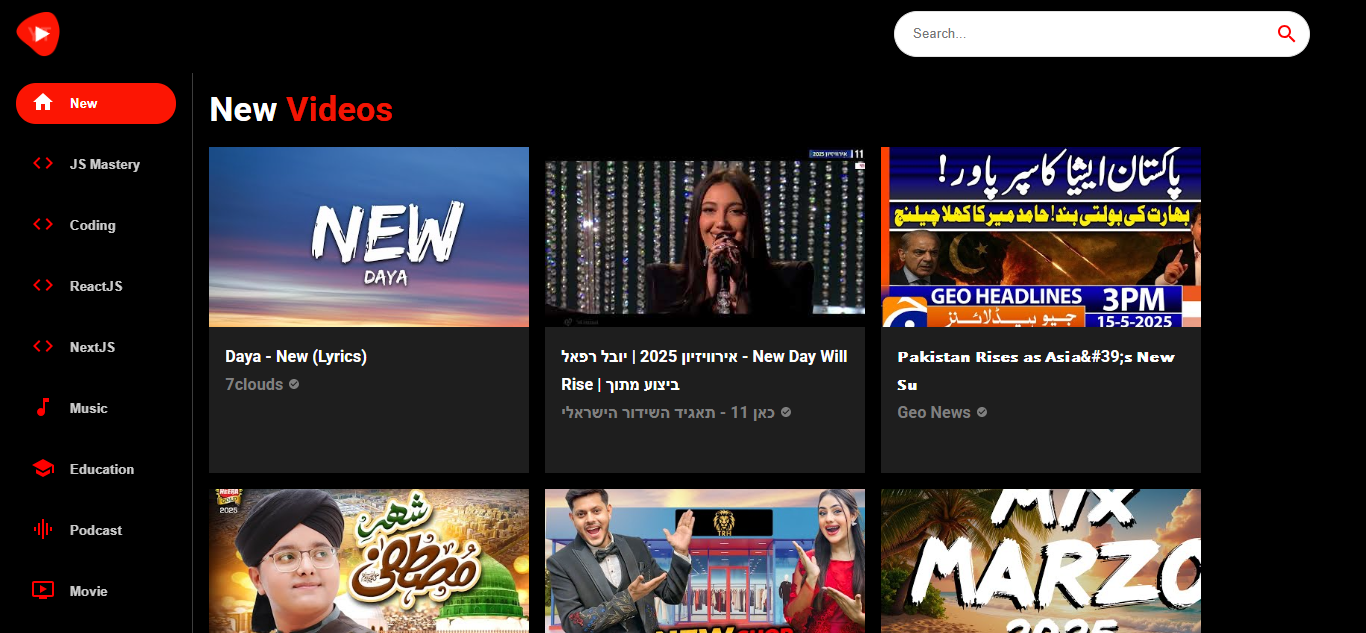A personal project replicating core YouTube functionality with a familiar, intuitive interface. Built with ReactJS and Tailwind CSS for a fast, responsive experience across desktops, tablets, and mobile devices.